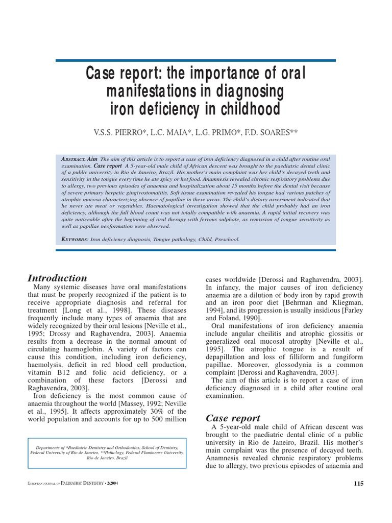 Patients with thalassemia may also have iron deficiency contributing to their anemia. If the patient does not tolerate oral supplements or in cases of poor absorption. Physical symptoms and appearance of iron deficiency anemia. Thrombus formation was ruled out as.